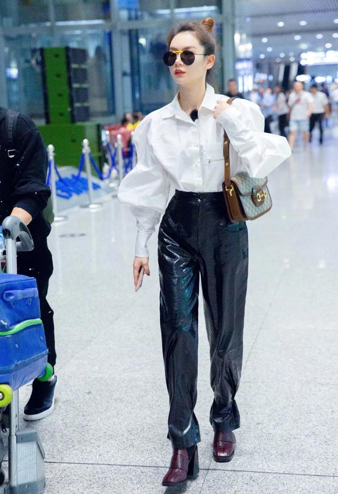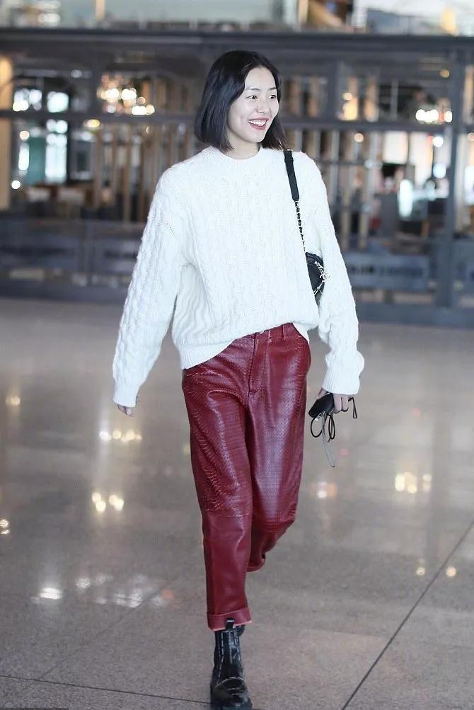 戚薇的机场LOOK是明星中走“酷帅风”的佼佼者,而她的众多搭配中,穿着漆皮的小脚皮裤的概率也是极高的。漆皮小脚皮裤从材质上,不同于平常皮裤材质,漆皮的亮度更高,总会给人眼前一亮的感觉。而小脚皮裤的基础裤型也不会过于挑剔腿型,再加上亮漆皮材质的点缀,一条普通的裤子也会成为超级时髦的单品。