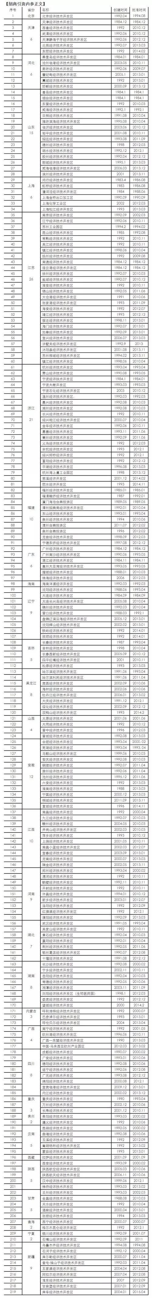 国家级经济技术开发区是由国务院批准成立的经济技术开发区,在我国现存经济技术开发区中居于最高地位,是各地招商引资和产业发展的重要载体。为了帮助大家了解当前国家级经开区的状况,招商引资内参(微信号zsyznc)对截止2016年6月份的全国共219个经开区的省份、创建和批准时间进行了统计,是诸位了解国家经开区必不可少的一份资料。