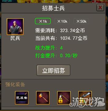 招募的时候多招募民兵,因为民兵最便宜,强化装备也便宜。无脑强化民兵的打钱速度是最快的。但是要舍得给民兵强化装备。不然速度也会不够快。简单来说,就是民兵便宜所以玩命的招募。然后强化装备增加民兵打钱效率。数量上去了,效率也自然上去了。
