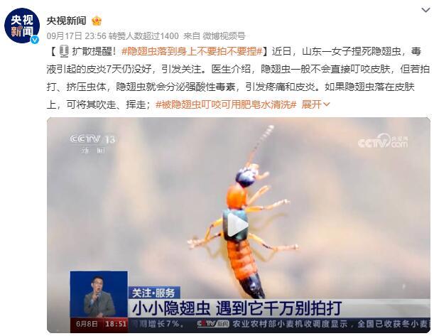 近日,山东一女子捏死隐翅虫,毒液引起的皮炎7天仍没好,引发关注。医生介绍,隐翅虫一般不会直接叮咬皮肤,但若拍打、挤压虫体,隐翅虫就会分泌强酸性毒素,引发疼痛和皮炎。如果隐翅虫落在皮肤上,可将其吹走、挥走;被隐翅虫叮咬可用肥皂水清洗,或用4%的小苏打水冲洗↓转发周知!