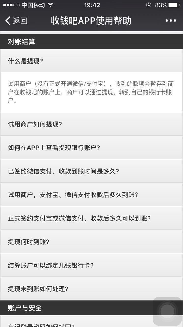 而根据收钱吧官网的介绍,没有正式开通微信、支付宝的试用商户,收到的款项会暂存到商户在收钱吧的账户上,商户可以通过提现转到自己的银行卡账户。同时,收钱吧要求试用商户单笔提现金额必须大于10元,并且每天仅可提现1次,提现时间是T+1个工作日到账。