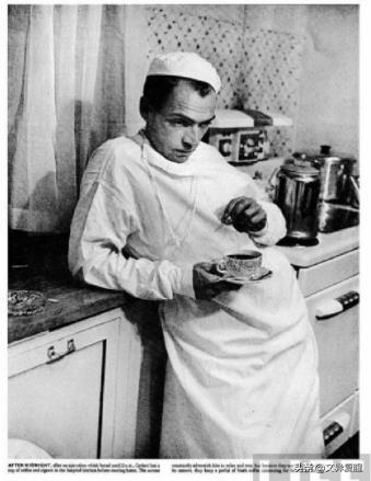 尤金 ·史密斯作为镇上唯一一名乡村医生,常常超负荷工作。图为在完成一例进行到第二天凌晨2点的手术后,他疲惫地站在医院的厨房里,喝着咖啡,抽着烟。