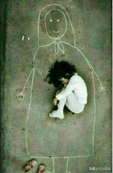 这是一名伊拉克孤儿院里的女孩,她在孤儿院的水泥地面上,画了一个妈妈,然后小心翼翼的脱下鞋子,卷曲着身子在妈妈的胸口处躺下、睡着了。