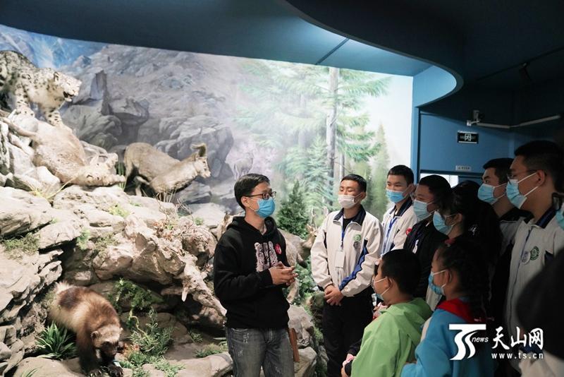 10月23日,新疆田马生物科技有限公司科普馆内,荒野新疆志愿者岩蜥为乌鲁木齐八一中学雪豹青年社团的中学生介绍雪豹等野生动物的生活习性。