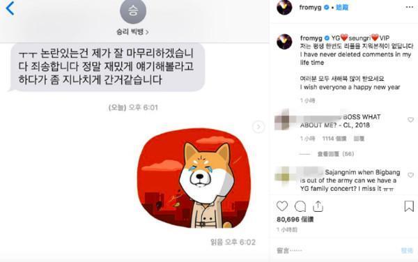 要说原本就是胜利的一个玩笑,但是没有想到因为粉丝的愤怒导致这件事情发酵的越来越大,就在近日社长梁铉锡在社交媒体上晒出了一份胜利道歉的聊天截图,胜利表示原本就是为了让对话更加有趣一点,但是没有想到引起了争议,同时保证会很好的处理争议。社长梁铉锡则是回了一个表情。同时面对粉丝质控删留言的事情,梁铉锡也表示:我这辈子从没删掉任何留言。
