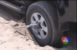 而当车轮已经陷在泥泞里时难以开出来时,这时该怎样才能将车开出来呢?其实,这时只要在轮毂上绑上一根铁柱,以这个铁柱作为支撑柱,这样就可以防止车轮打滑而开出来了。如下: