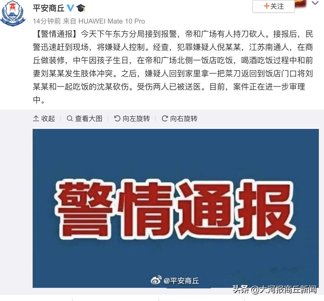 6月28日19时47分,商丘市公安局官方微博发布警情通报称:今天下午东方分局接到报警,帝和广场有人持刀砍人。接报后,民警迅速赶到现场,将嫌疑人控制。经查,犯罪嫌疑人倪某某,江苏南通人,在商丘做装修,中午因孩子生日,在帝和广场北侧一饭店吃饭,喝酒吃饭过程中和前妻刘某某发生肢体冲突。之后,嫌疑人回到家里拿一把菜刀返回到饭店门口将刘某某和一起吃饭的沈某砍伤。受伤两人已被送医。目前,案件正在进一步审理中。