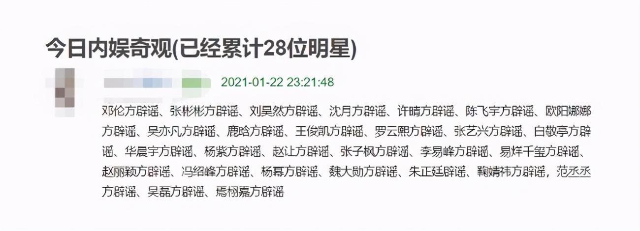 更有意思的是,在华晨宇、张碧晨等人发布微博之后,就在昨晚,包括冯绍峰、赵丽颖、易烊千玺、王俊凯、杨幂、刘昊然等28位明星相继就与自己有关的言论辟谣。一时之间,各种大瓜真真假假,虚虚实实。
