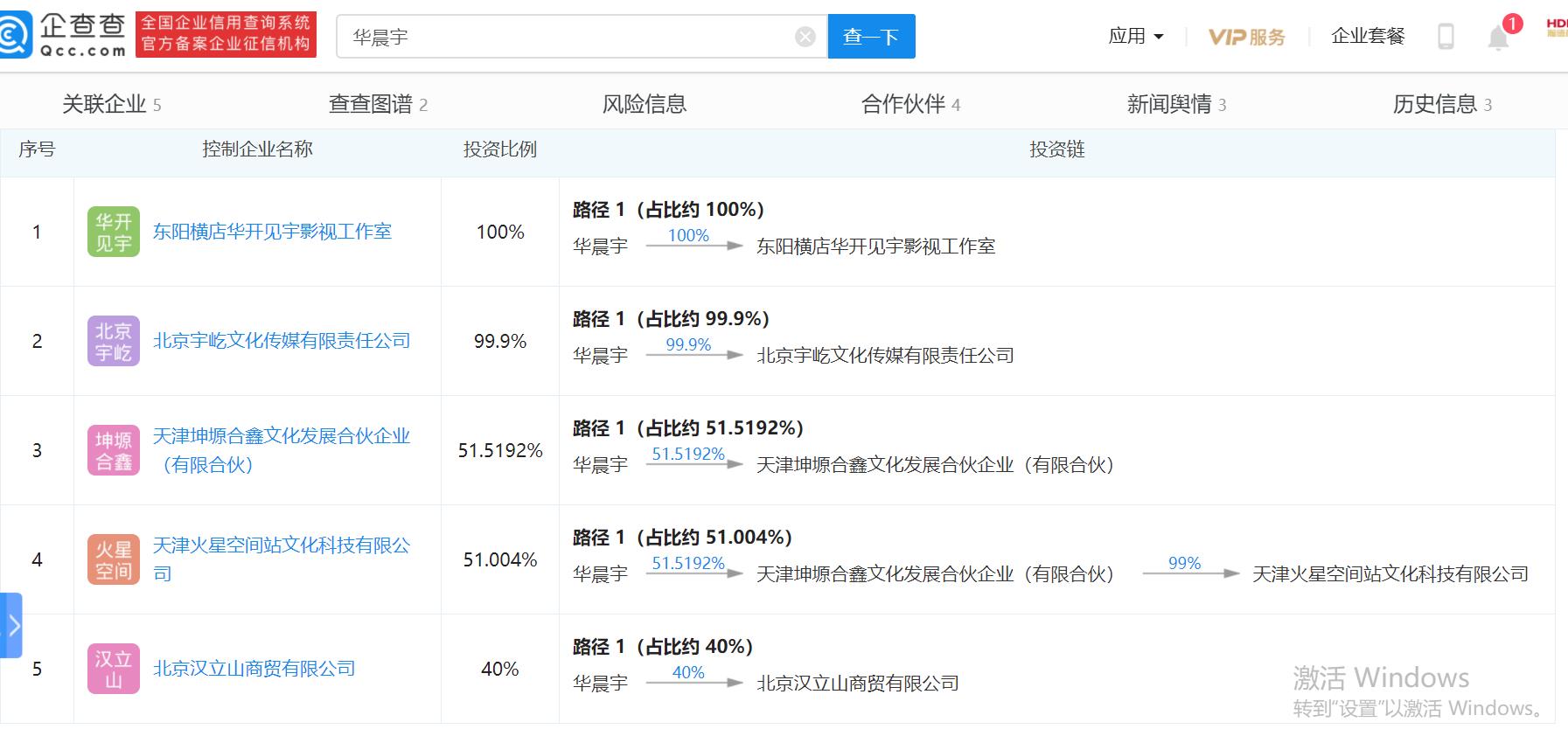 根据企查查,华晨宇名下一共拥有东阳横店华开见宇影视工作室、北京宇屹文化传媒有限责任公司、天津坤塬合鑫文化发展合伙企业(有限合伙)、宁波缘拓股权投资合伙企业(有限合伙)、北京汉立山商贸有限公司等5家公司。同时,其父亲华福熊担任法人的天津火星空间站文化科技有限公司,其控股股东是华晨宇旗下的天津坤塬合鑫文化发展合伙企业。所以说,华晨宇作为实控人的企业实体有6家之多。其中宁波缘拓股权投资合伙企业(有限合伙)认缴资本最高,为5100万元。