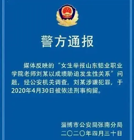 经公安机关调查,刘某涉嫌犯罪,于4月30日被依法刑事拘留。29日,山东铝业职业学院解除与刘某的劳动合同,并报请教育主管部门撤销其教师资格。