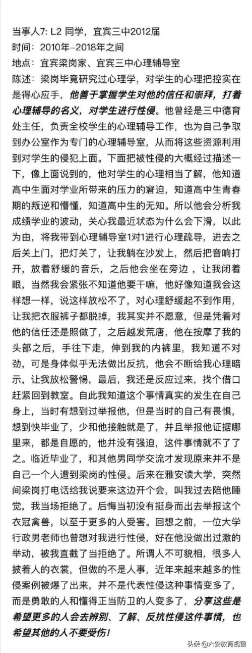 根据目前统计的情况,在2010-2020十年期间,梁岗利用班主任和心理健康中心主任的身份,最初是伪装成对学生进行心理疏导,涉嫌对班上的男生实施各种程度的性侵和骚扰,统计到的受害者已经超过20人,一些被侵害的学生口述和整理的文字材料触目惊心。