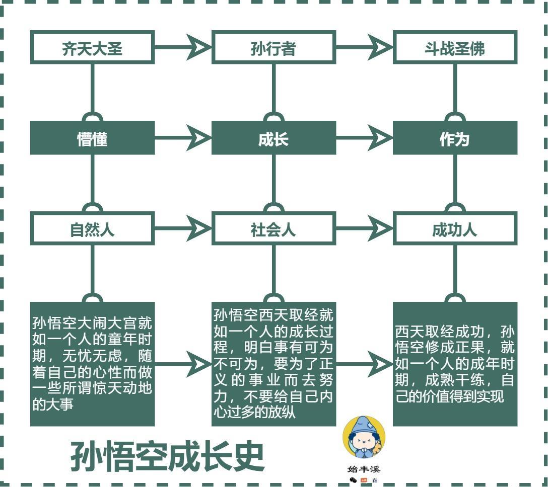 孙悟空的成长过程是一个修心的过程,为了追求自由和平等,他大闹天宫,放纵自己心性,却受到惩罚,通过西天取经,他才真正做到了心的平静。