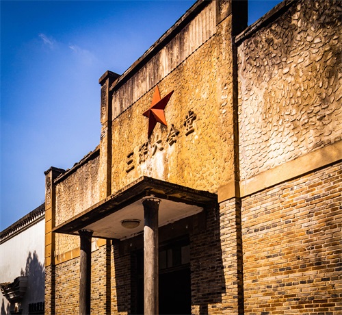 三深大会堂原样保留了文革时期的建筑样貌。大会堂内的墙壁上随处可见文革时期的毛主席画像。堂内左右两侧各摆放一排西溪湿地的美景摄影照片供游人欣赏。