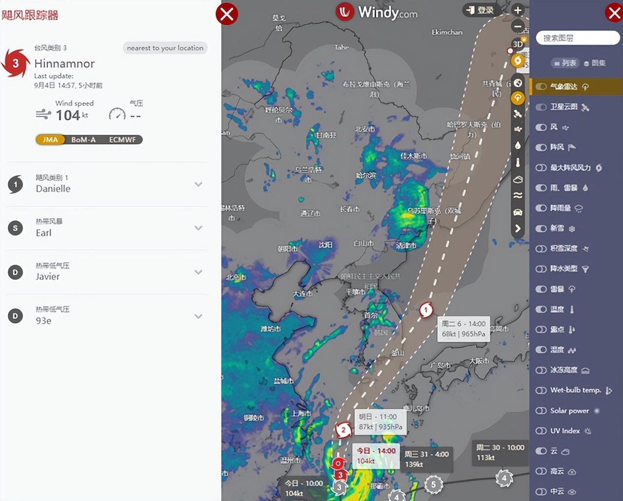 https://c.quk.cc/3/z14/x225ohqr4st >使用教学 STEP 1 开启 Windy 网站后会依照使用者的定位信息显示所在城市的气象信息,左上角会有气温、天气资讯、风向、降雨机率和未来三天的天气预测,消失或没显示可点选中间上方 Windy 标志就会出现,若不想开启浏览器的定位权限,也能直接在左上角搜索框里输入要查询的地点,支持中文。 在网站地图点击任一位置,或是将标记点拖拽到某个范围,就会显示该地点的气象信息。 左上角「设置」功能切换不同单位,例如风速、温度、降雨量、海浪、降雪、气压、海拔、距离等等,不过应该会以使用者所在位置选择最常用的选项。 STEP 2 从右侧切换要检视的图层项目,例如:雷达、卫星、风速、雷暴、温度、湿度,如果点选「更多图层」还会有更多可切换显示的气象数据,功能很多,自行探索一下吧! 下图是切换为卫星云图图层的显示样貌,也是大家经常在天气预报中看到的画面。 STEP 3 右上角有一个「台风追踪器」会显示距离用户最近的台风(大西洋和东北太平洋称为飓风),例如最新的Hinnamnor就会在网站显示预测路径、风速、气压等信息,网站提供的路线预测是从不同的来源取得信息:JMA(日本气象厅)、BoM-A(澳洲气象局)和 ECMWF(欧洲中期天气预报中心), 点选进行切换。 STEP 4 除了从右侧点击要检视的图层,右下角还能开启关闭动画、气压显示,或是在图层中加入其他要查看的信息。 STEP 5 从左上方搜寻特定地点,例如北京市,下方会显示未来一周、每三小时的天气预测(如果要缩小为每小时预测需要付费升级为 Premium 会员),包括湿度、降雨量、风速、阵风和风向等等,左下角还有海浪、风速等等,可查询的气象相关资讯非常庞大。 网站链接:https://c.quk.cc/3/z14/e2s2wckhnwe >如果你喜欢本文,或者觉得本文对你有帮助,请分享出去,让更多的人因此而受益