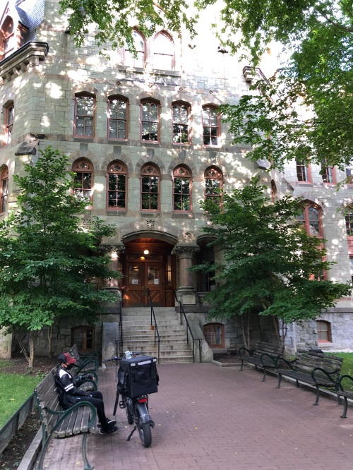 经过法学院时看到了外卖的小哥正在送餐时忽然感觉饿了,在宾大校园里已经转了半天,我也该找一个地方吃饭了,顺便歇一下想想接下去该去费城的哪个景点。未完待续......