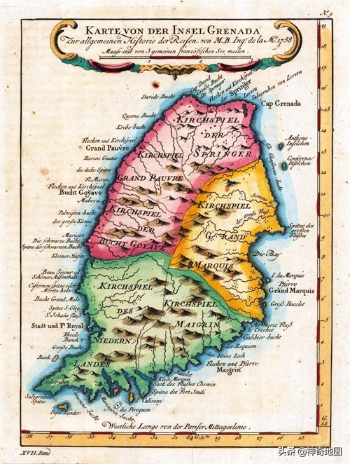 历史上的格林纳达于1498年(明弘治十一年)被哥伦布船队发现,由于岛的形状酷似石榴,因此得名为“格林纳达”(西班牙语意为石榴)。忙着从南美掠夺金银的西班牙人并没有把这个小岛放在心上,过了一个多世纪后,法国人乘虚而入,1650年(清顺治七年)好心的印第安人收留了法国人,让他们建立定居点。但法国人马上鸠占鹊巢,于1674年(清康熙十三年)将格林纳达变成殖民地。欧洲七年战争(1756-1763),法奥(法国-奥地利)联盟不敌英普(英国-普鲁士)联盟,根据战后签订的《巴黎条约》,格林纳达殖民地被割让给英国。期间虽然被法国重新夺回,但1783年(清乾隆四十八年)的英法西《凡尔赛条约》正式确认该岛属于英国所有。