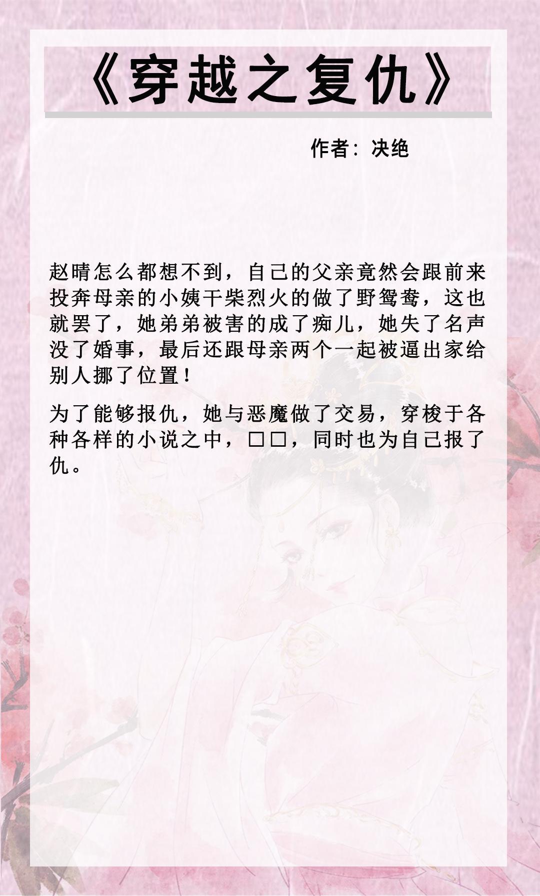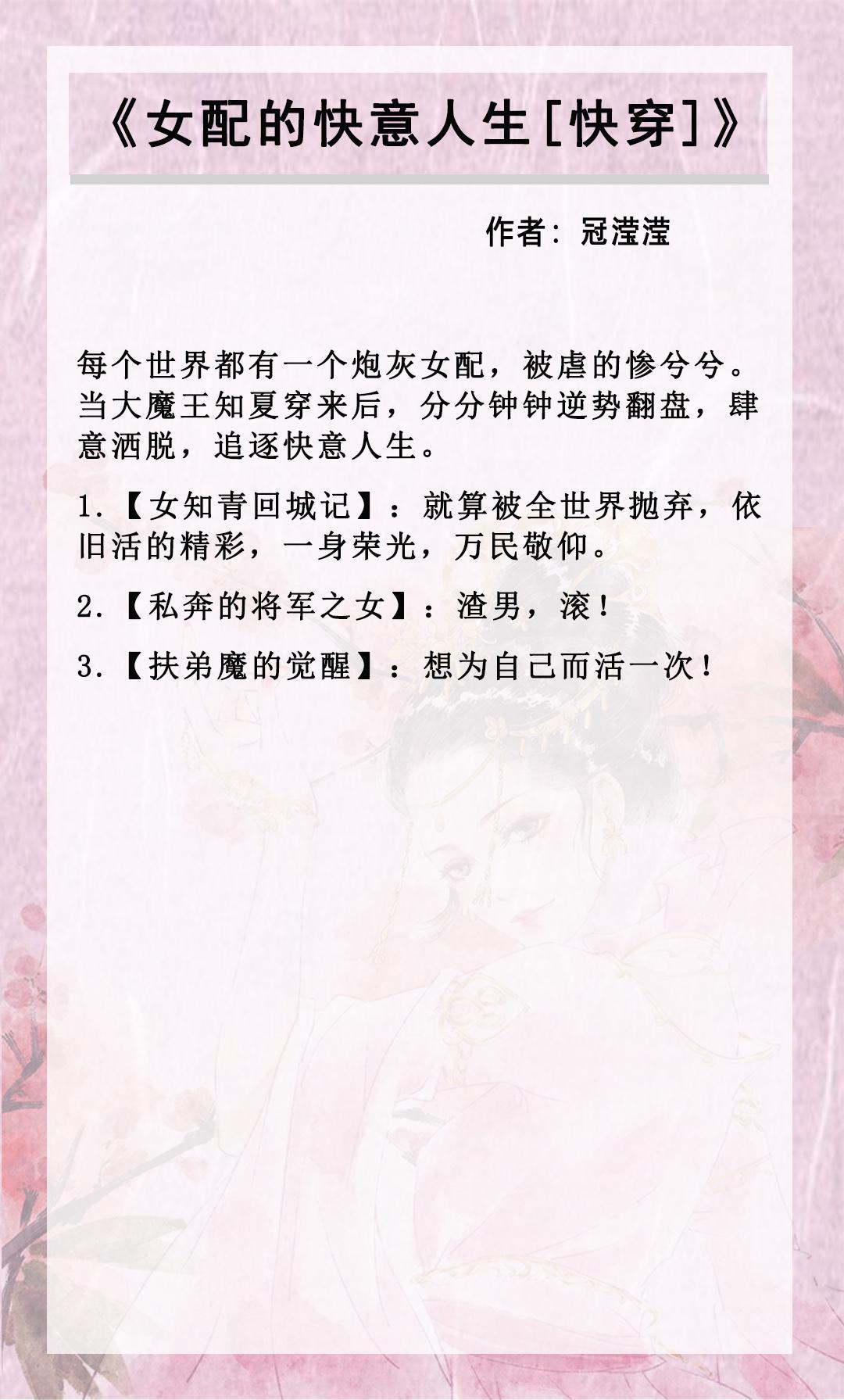 短评:快穿,无CP。女主是古代宅斗言情小说的女配,生父与小姨勾搭成奸,弟弟成了痴儿,女主和母亲被迫出家让位。为了能够复仇,女主与魔鬼做了交易,穿梭在无数小说当中,替原主虐渣虐小三。女主人设讨喜,格局大,三观正,致力于实现男女平权,打脸剧情也不差。还不错的一篇快穿女配逆袭复仇爽文,推荐阅读。