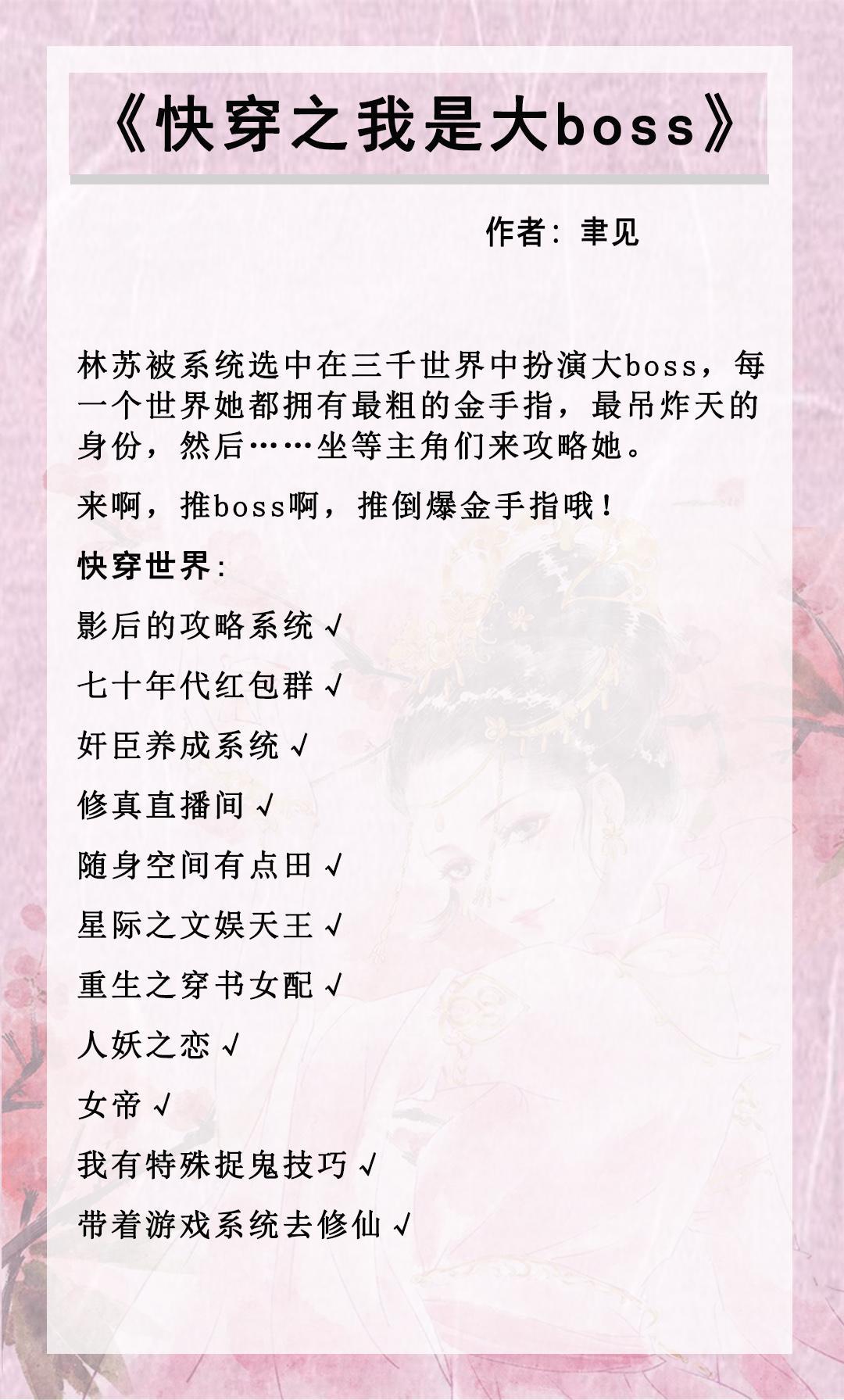 短评:快穿,无CP。女主原是缥缈界的一名修士,渡劫失败后绑定晋江003系统,只要女主完成任务,就能得道成仙。女主的任务是去往三千小世界,扮演大BOSS,给主角送经验送装备。女主需要做的就是带着金手指作天作地找大气运者麻烦,坐等被主角们攻略,爆出金手指送给主角们。