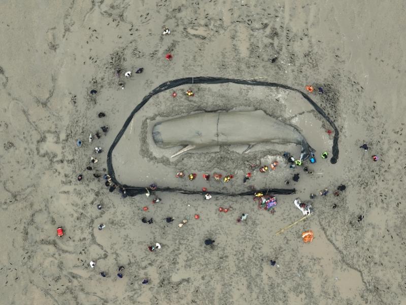 鲸鱼的身体完全显现后,现场救援人员观测到这是一头抹香鲸,体长约19米,体重约70吨。陈健推测,这个体长的抹香鲸属于老年个体,可能存在受伤或年老体力不支的问题。