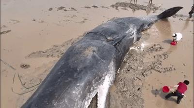 据宁波海洋世界专家介绍,受退潮影响,没有海水浮力支持,直接将巨型抹香鲸推回海里是不可能完成的任务,而搁浅鲸鱼皮肤暴露,水分流失,内脏又受自身体重压迫而受损,身体状态极度虚弱,轻易搬动它反而可能造成严重后果。