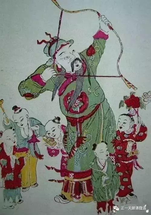 在舊時婚禮當中,張仙的形象多被人們繪在紙上,作為神像供奉在室內。這類畫像的畫面多為一穿著華麗、手持弓箭射向天空中天狗的男子,他的膝下往往還繪有一群神態各異的兒童,突出表現了其送子的功能。有的畫中還畫有一隻麒麟,含有五子登科,麒麟送子之意。人們通過對張仙的膜拜,寄託自己新婚之後盼望早生貴子的願望。