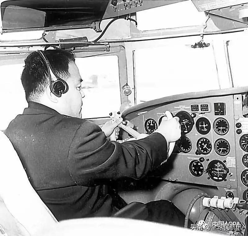 军委民航局飞行大队大队长张瑞霭在驾驶飞机