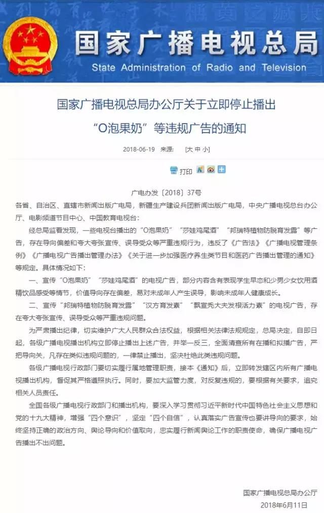 6月19日,“国家广播电视总局”微信公众号发布消息,要求自即日起,各级广播电视播出机构立即停止播出“O泡果奶”“莎娃鸡尾酒”“邦瑞特植物防脱育发露”等广告。