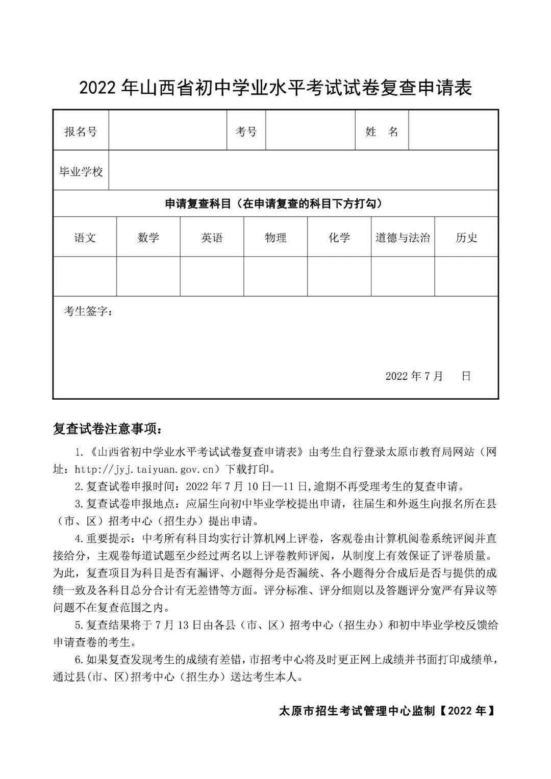 考生可于7月10日至11日申请查卷,逾期不再受理。复查内容包含主观卷是否有漏评、合分错误等,客观题及评分宽严问题不在复查范围之内。考生须在“太原市教育局网站”“中考招生”栏目下载填写《山西省初中学业水平考试试卷复查申请表》并于7月11日18时前提交报名单位,7月13日报名单位向考生反馈查卷结果。