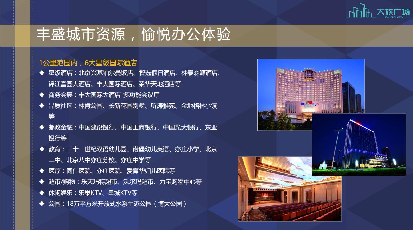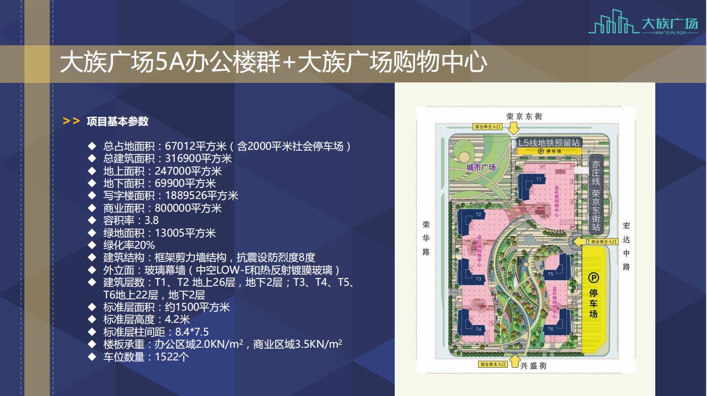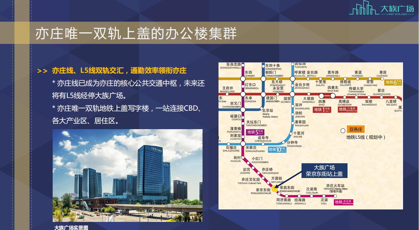 大族广场 位于亦庄核心区域,被誉为亦庄小长安街,荣华路南路地理位置优越。本案距南苑机场仅10公里,距首都机场30公里,距规划中的第二机场仅35公里,距离国门CBD仅14公里,京沪高速与本案近在咫尺,位置十分优越。四至:项目北临荣京东街、西邻亦庄主干道荣华南路、南邻兴盛街、西邻宏达中路,项目西侧紧邻荣京东街轻轨站。交通:目前轻轨亦庄线的荣京东街站到本案,未来规划中的L5线将与轻轨荣京东街站交汇,本案临近亦庄主干道荣华南路,且四面临街,交通路网发达,出行方便。