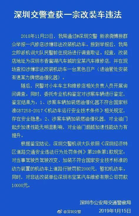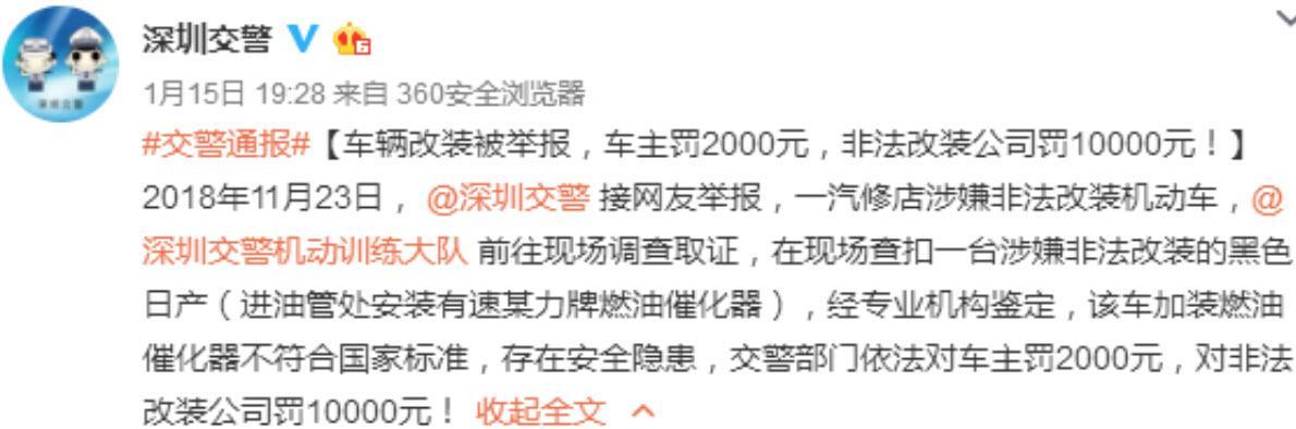经过2个月的发酵,深圳交警作出回应:涉案车辆加装燃油催化器不符合国家标准GB7258-2017《机动车运行安全技术条件》相关规定,存在安全隐患。涉案车辆加装燃油催化器对全油门起步加速性能无明显影响,对全油门超越加速性能动力有所提升。