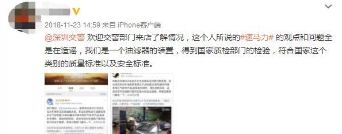 随即有疑似速马力老总微博挑衅:速X力一个油滤器的装置,得到国家质检部门的检验,符合国家这个类别的质量标准以及安全标准。而且不在非法改装的清单列表内。法无禁止即可为,法无授权即禁止……