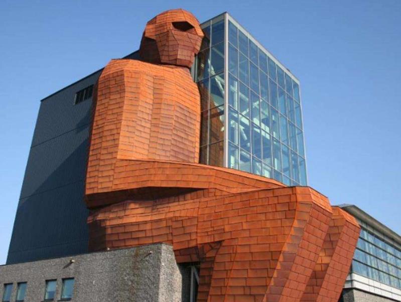 它是著名的荷兰人体博物馆,它的外形结构很简单,我们远远的看到一个巨大的人型坐在这座建筑上,博物馆的外观简洁大方,人们瞬间明白它的内容,人型结构建筑正襟危坐,用一直胳膊紧紧的抱住旁边的玻璃外墙,咖啡色的外表在绿树的映衬下格外显目,充满童趣又充满了教育意义,很多慕名而来的游客突然就明白了博物馆的用心良苦。