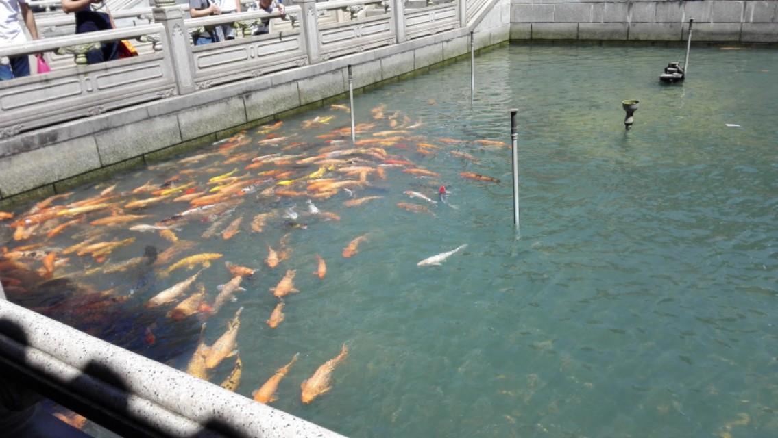 鱼儿嬉戏,旁边有卖鱼饲料,可以考虑给小孩搞点。