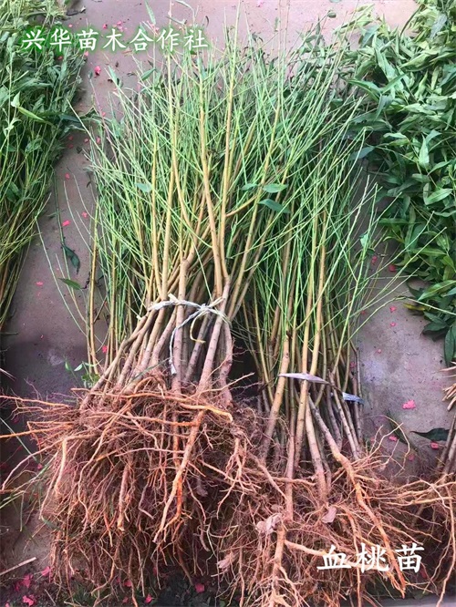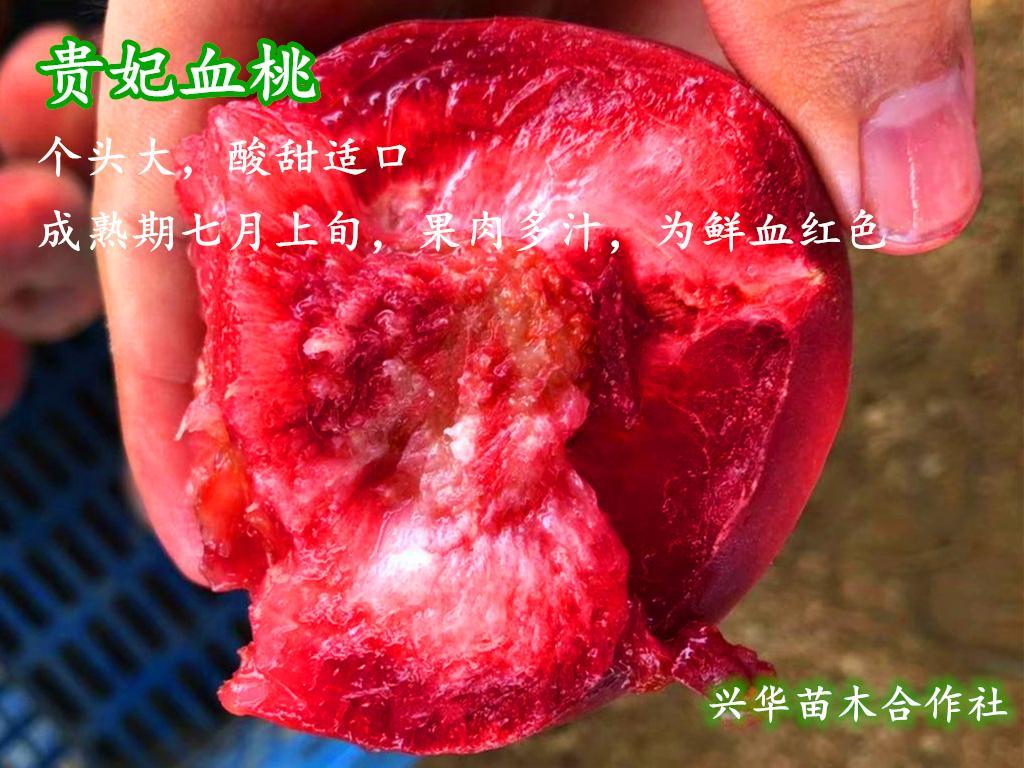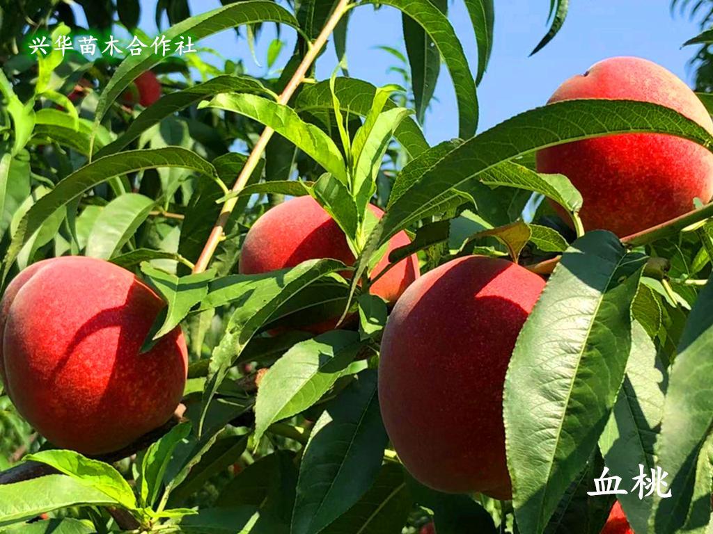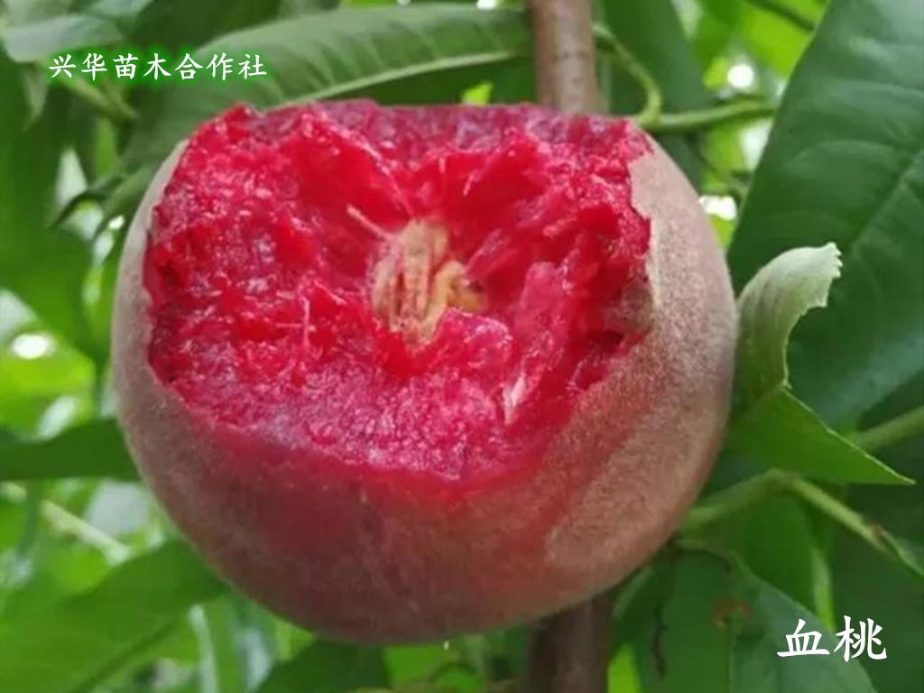 血桃外表普通,外皮着红色,乍眼一看,和普通红毛桃没什么差别。可是一口咬开里头的瓤是血丝般的红,就像身体里的红色血管这就是血桃最吸引人的特点,果肉血红色,就连流出来的汁液也是鲜血红色。血桃除其汁如血外,含糖量14%,甜酸可口,风味精美,品质上乘,较耐储运,可自然贮存7-10天,不裂果,丰收性强,属于桃中较高端特色果品。兴华苗木合作社2015年将血桃苗引入我苗木基地,现培育一级血桃苗30万株左右,经栽培观察发现,血桃如其名最大的亮点就是果肉和果汁是鲜血红色,且丰产稳产,是一个极具特色桃品种。