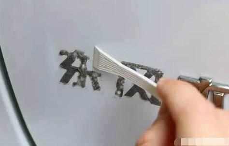 这样要先用热吹风对着车标一直吹几分钟,这样子车标的胶水就很容易自然融化,这时候只需要用卡片轻轻的一刮,就能轻松的把车标给刮下来。