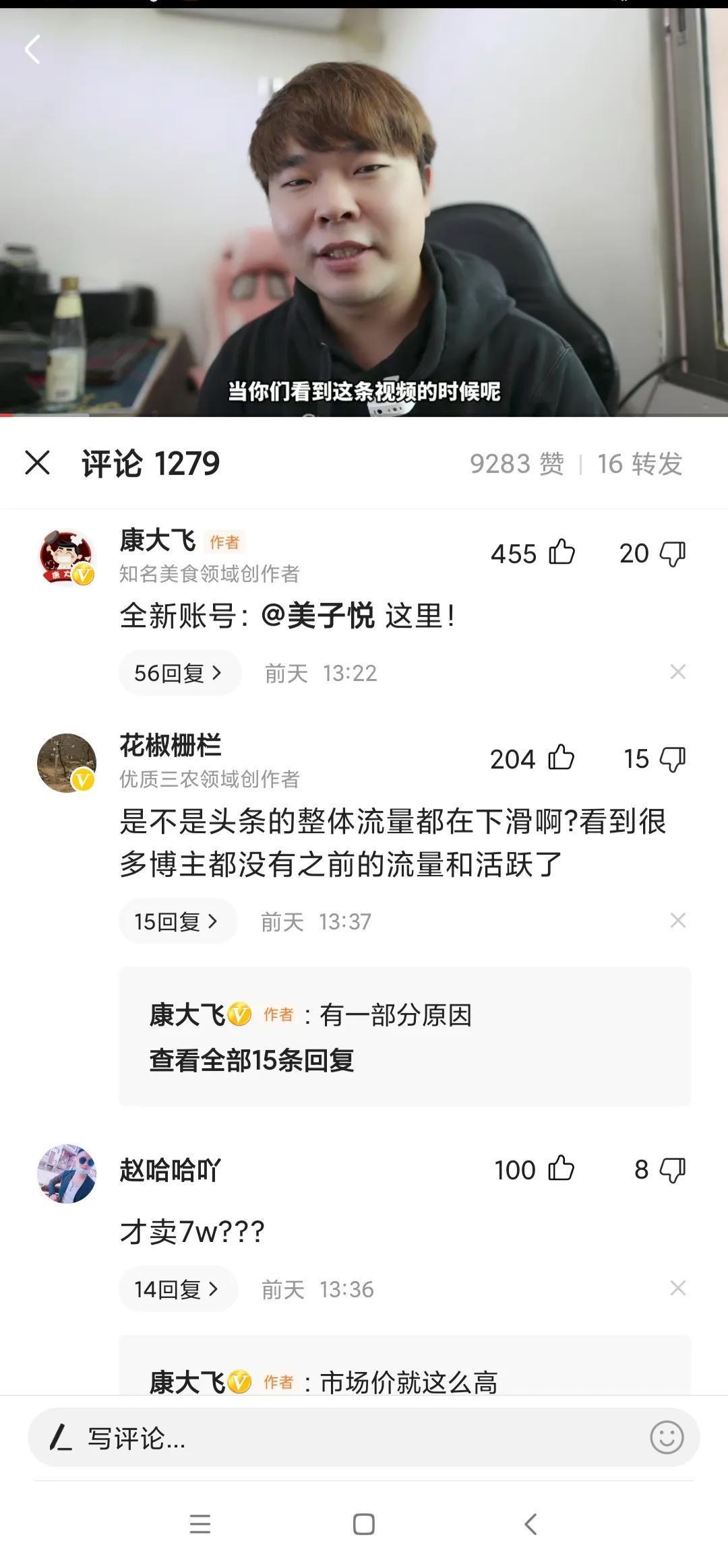 康大飞只能以7万块钱的价格出售,这个现在的自媒体账号,并表示以后可能不会再做美食领域了,从头再来,目前已经建立了新账号。