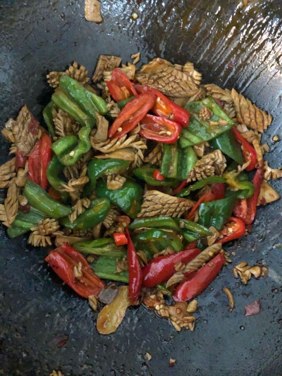 制作方法6、腰片出味道即熟,开始下入青红辣椒段,继续翻炒,不要勾芡,干巴的腰片最好吃