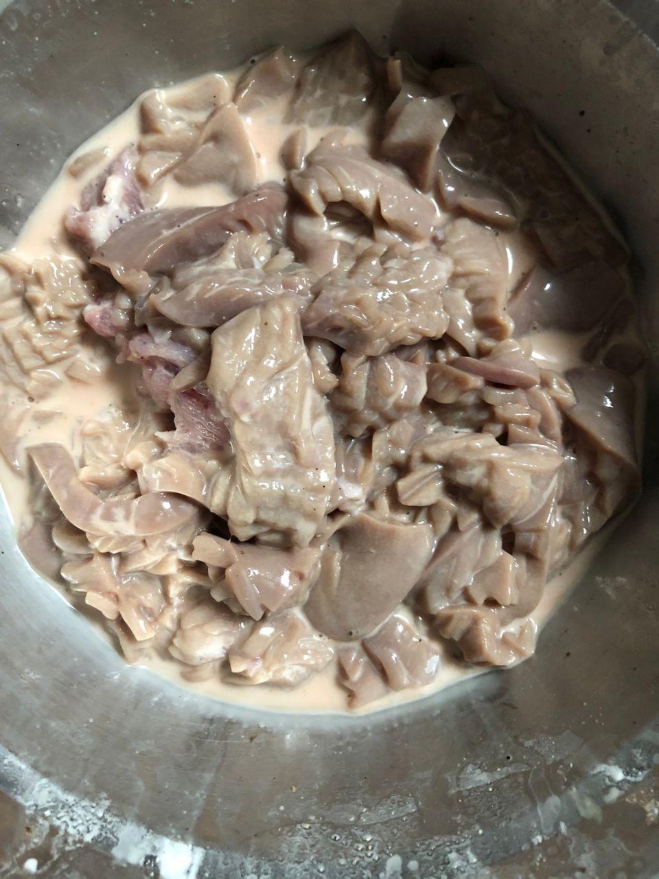 制作方法3、洗干净的腰片加入淀粉和料酒抓抓,再洗下,,然后加入香料盐和十三香和酱油蚝油腌制