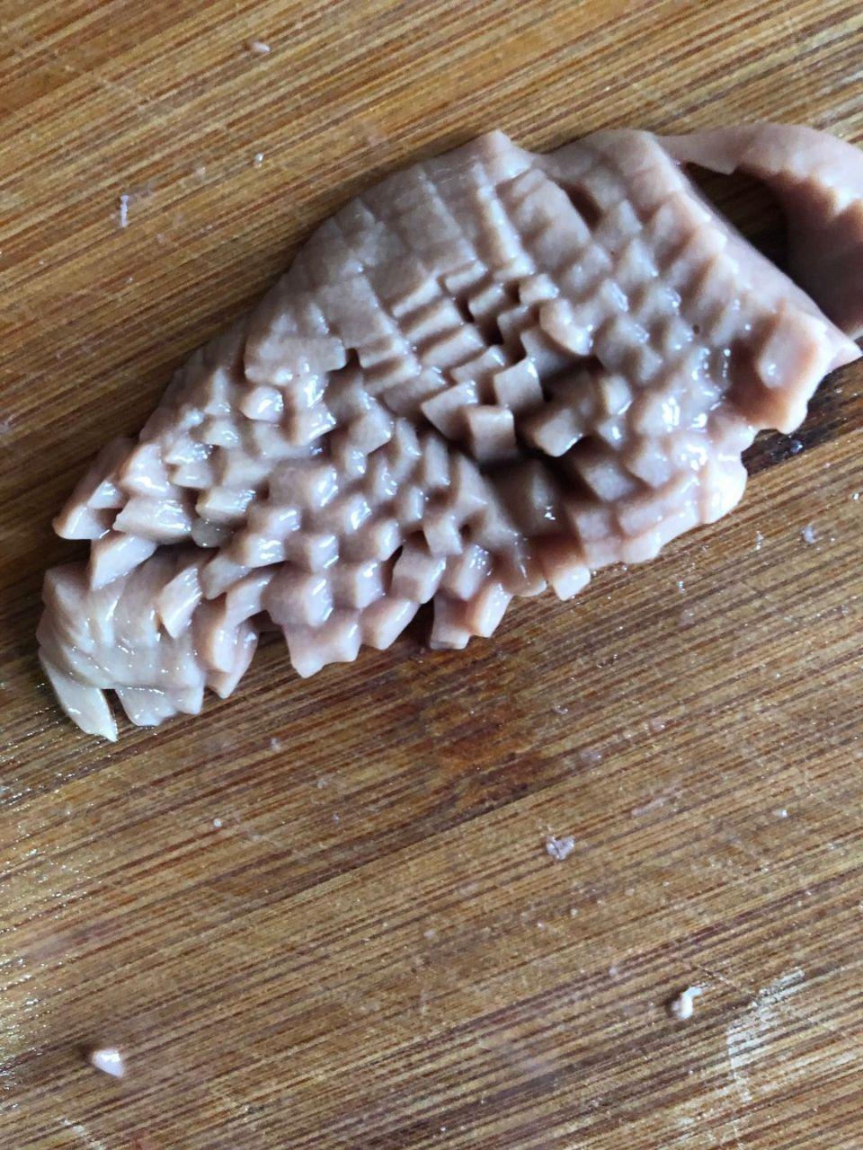 制作方法2、腰片改刀横竖切割,成型后自然出花,放水里浸泡备用