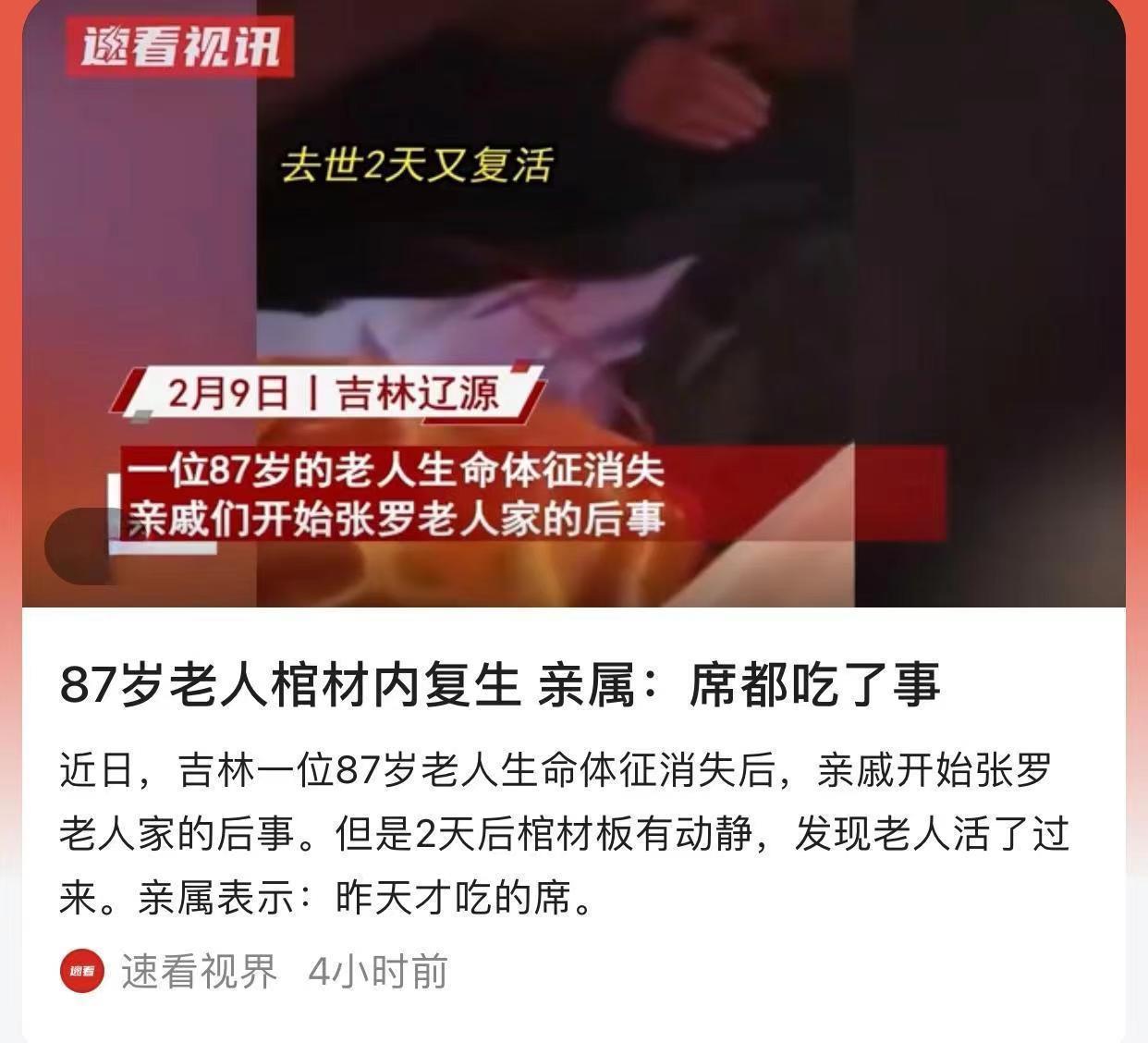 2月9日,吉林辽源,一位87岁的老人在当天生命体征消失,亲戚们开始张罗老人家的后事,村里其它老人称人去世要等3到7天再葬,所以他们就没有给老人钉棺材板,两天后天色渐晚,有人过来点蜡烛发现棺材有动静,打开一看,老人竟然活过来了,