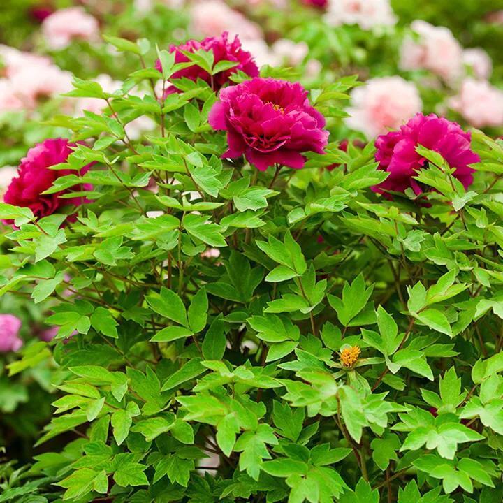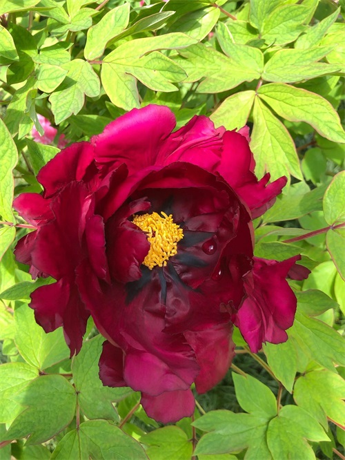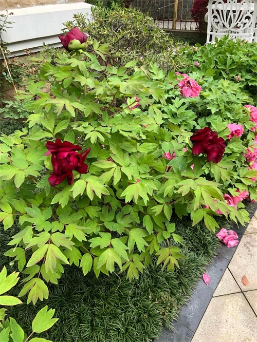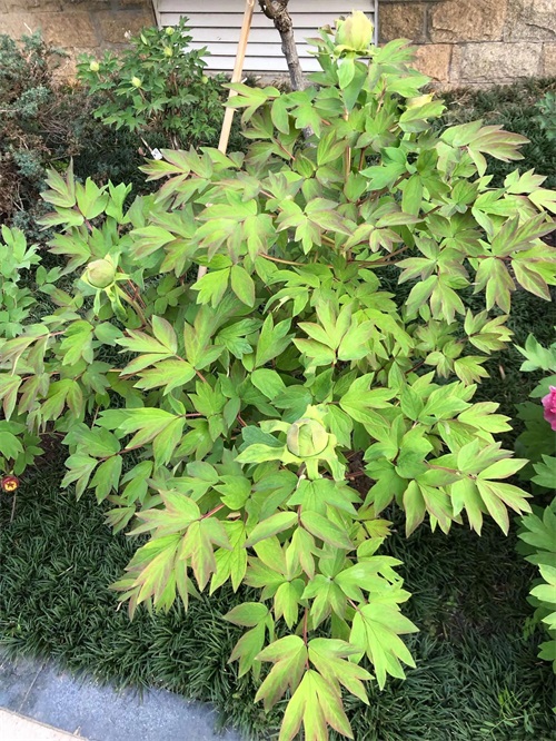 冠世墨玉牡丹 株型直立紧凑,分枝极少,萌蘖枝亦少。花朵直上,生长旺盛。
