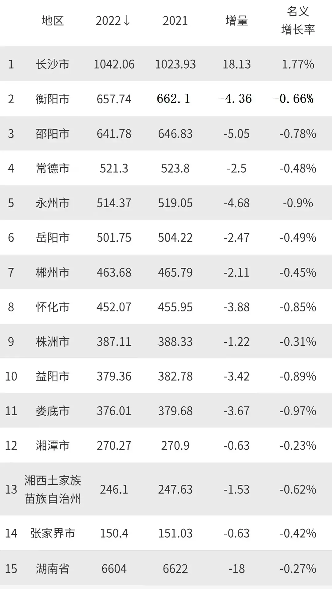 2022年,长沙市常住人口为1042.06万人,比上一年增加18.13万人,真是一骑绝尘,比第二名衡阳多了384.32万人,这是省会的优势,毫无疑问的。再来看看其它城市的常住人口情况。