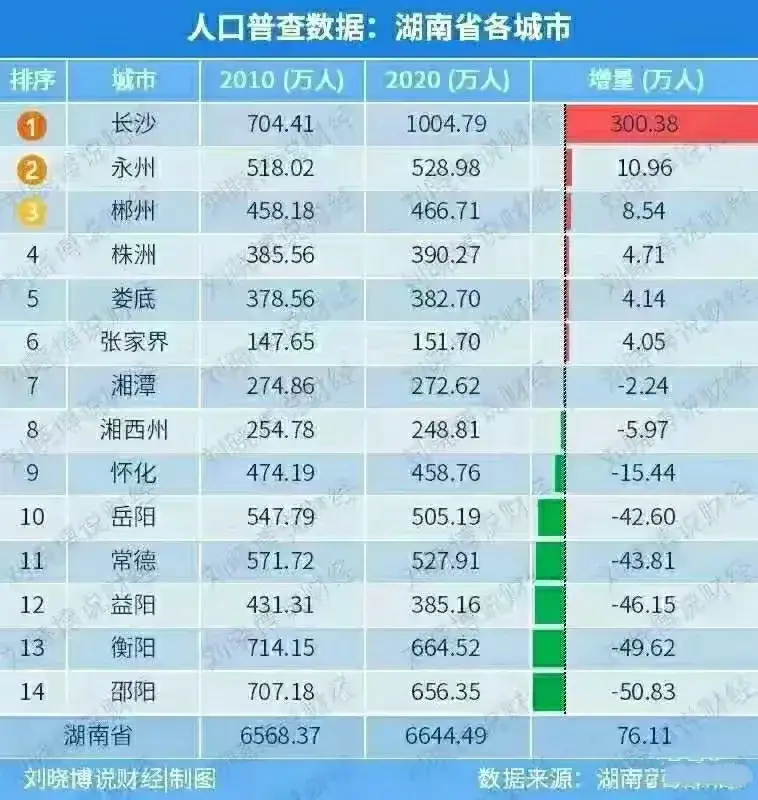 第七次人口普查中,长沙就不用说,至此,还有五个市为正数,其它八个市为负数。这其中有五个市的人口流失非常严重,人口流失都超过了40万人,分别是邵阳50.83万、衡阳49.62万、益阳46.15万、常德43.81万和岳阳42.6万。具体情况看下面图表。