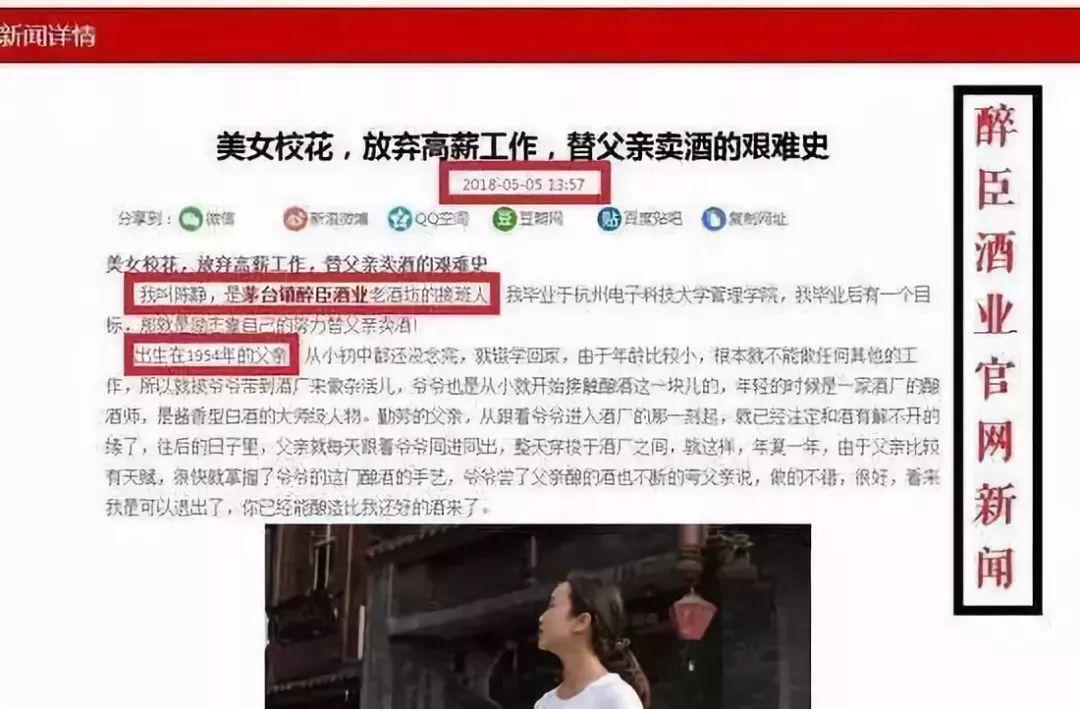 在今年11月21日,仁怀市市场监管局对“陈静替父代言卖酒”推文展开调查,初步认定为虚假宣传。11月27日,监管部门决定依法立案。经监管部门调查,网络上的“陈静替父代言卖酒”部分推文,系贵州省仁怀市茅台镇醉臣酒业有限公司自行设计、制作。推文中的“陈静”,实际名叫李燕,是遵义市播州区人,醉臣酒业员工;文案中的“父亲”名叫祁联移,既无酒厂也未从事酿酒。两人之间,非父女关系。