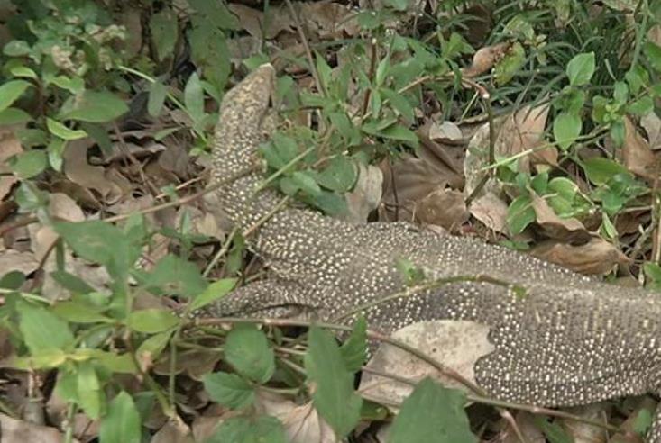 这条巨蜥全长一米多,浑身银黑色,布满白色斑点,整体和土地的颜色非常相近,加上身处草丛中,如果是小孩老人或者视力有问题的人,很可能就察觉不到。