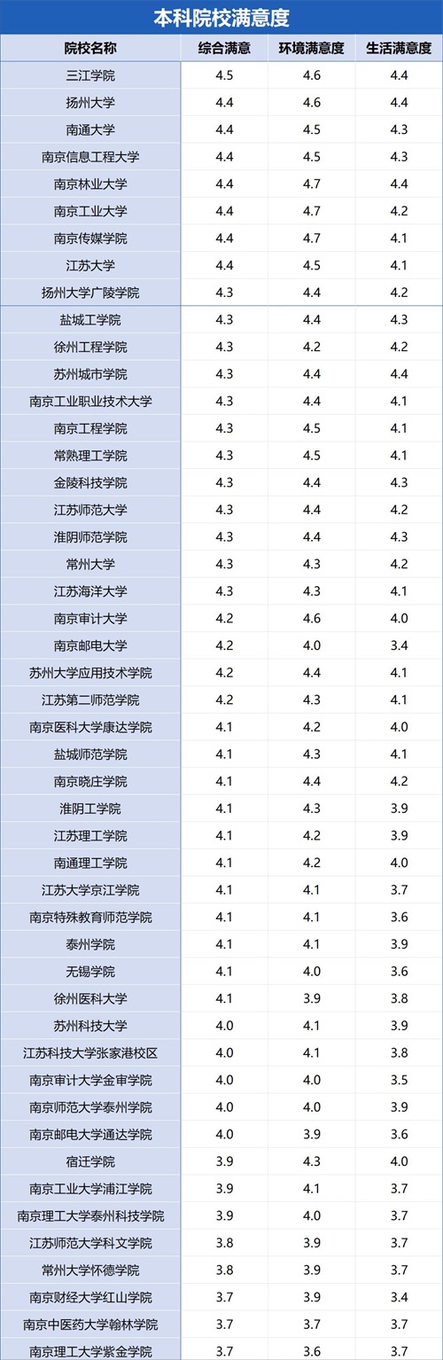 对院校满意度的调查中,分为三块:综合满意度、环境满意度、生活满意度。下面江苏专转本招生院校按综合满意度的排序(满意度总分为5)。