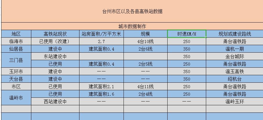 台州市下辖6个县级单位和城区,截至目前为止有4个高铁站建成使用,其中一个位于市区,其余三个分布在下辖的县市辖区内(临海市的高铁站在扩建中),除了这四个开通的高铁站外,仙居县、玉环市、天台县、三门县东、温岭市西五个地区都有在建的高铁站,其中玉环天台以及仙居县结束没有高铁的历史,而三门和温岭都将拥有二个高铁站;市区站和温岭站以及三门县高铁站和临海站这四个高铁站都是位于甬台高铁线上,仙居县高铁站位于温杭高铁线上,温岭新建的高铁站和玉环市高铁站位于温玉高铁线上、天台县高铁站位于绍杭台线上。