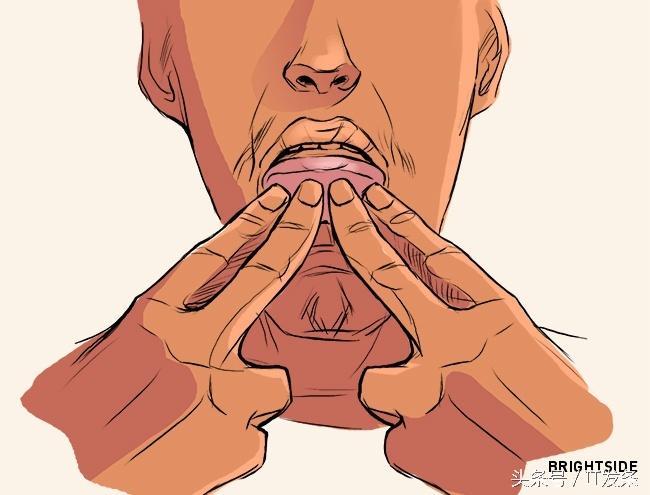 第三步:现在,你需要你的舌头移动到正确的位置,并用手指小心地按你的舌头,并轻轻向下按压其尖端。最后的效果是,你的舌头形成了“曲线”。注意:你的手指入嘴的尺寸,不应该超过约四分之一。
