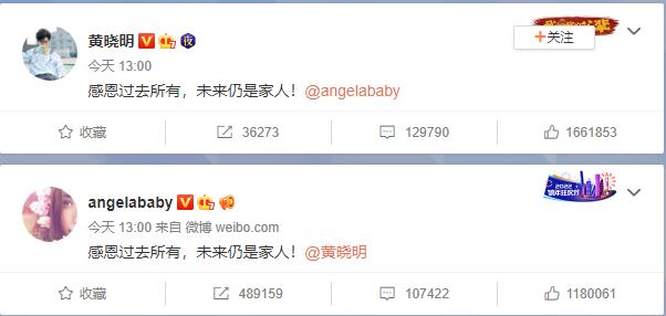 就在刚刚,黄晓明跟杨颖同时发了一条微博“感恩过去所有,未来仍是家人!”,并艾特了对方。