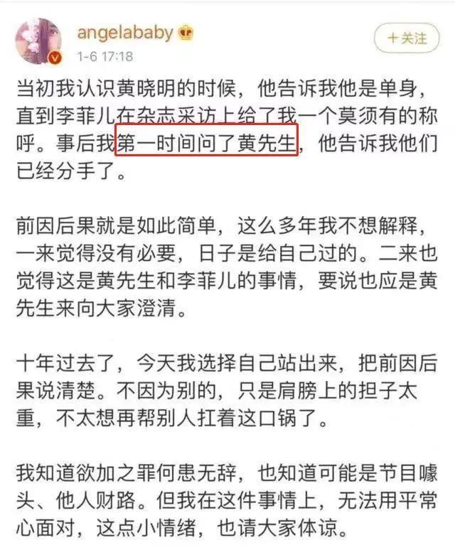 这条微博发出没多久,黄晓明也发了微博声明,强调baby并不是第三者。